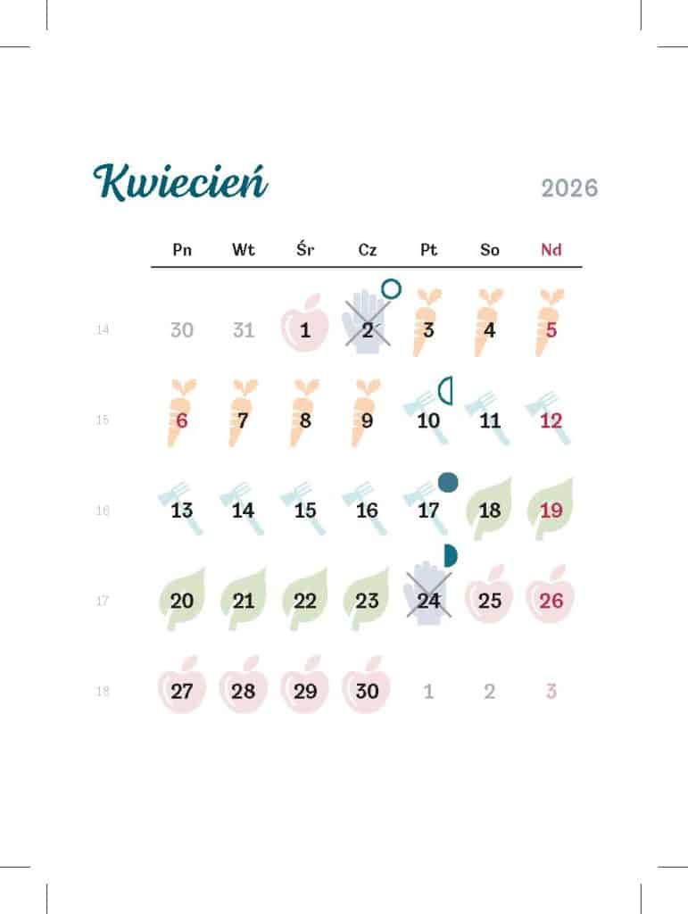 Kwietniowe dni korzystne, zaznaczone rączkami, to najlepszy czas do wysiewu roślin ciepłolubnych metodą Winter Sowing, a także do wysadzania rozsad bylin i hardy annuals przygotowanych właśnie metodą zimowego wysiewu. Rośliny wysiewane zimą powinny już mieć po 2–3 listki właściwe i spokojnie mogą zostać wysadzone na rabaty.