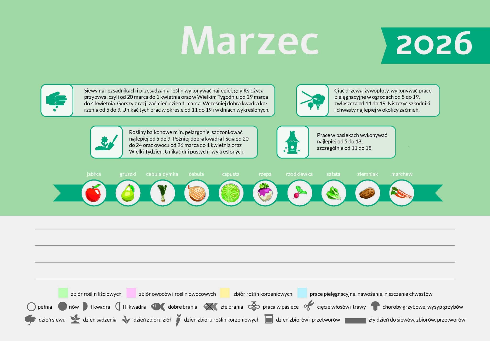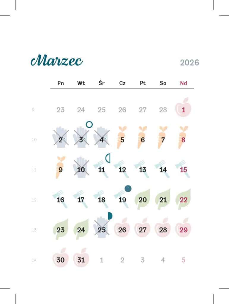 Gdy Księżyca ubywa (od 5 do 18 marca), zwłaszcza w kwadrze uprawy, można zbierać zioła korzeniowe. Zbiory można też przeprowadzać w kwadrze liścia w drugiej połowie miesiąca. Najwcześniejsze siewy do gruntu roślin korzeniowych jednorocznych – marchwi, pietruszki, pasternaku, skorzonery, rzodkiewki, a także cebuli – najlepiej rozpocząć w kwadrze korzenia (od 5 do 9 marca). Później bardzo dobry termin będzie w kwadrze liścia i owocu pod koniec miesiąca oraz Wielki Tydzień. Dzień 1 marca jest mniej wskazany z racji zaćmień. Jeżeli będzie zbyt zimno, warto przełożyć siewy na Wielki Tydzień. W tym roku przypada on na przełomie marca i kwietnia, w kwadrze owocu i korzenia, czyli od 29 marca do 4 kwietnia. Zgodnie z tradycją to najlepszy czas do siewów. Dymkę sadzić najlepiej także w kwadrze korzenia (od 5 do 9 marca), bardzo dobra będzie też kwadra liścia i Wielki Tydzień. W trzeciej kolejności należy wybierać kwadrę owocu.
