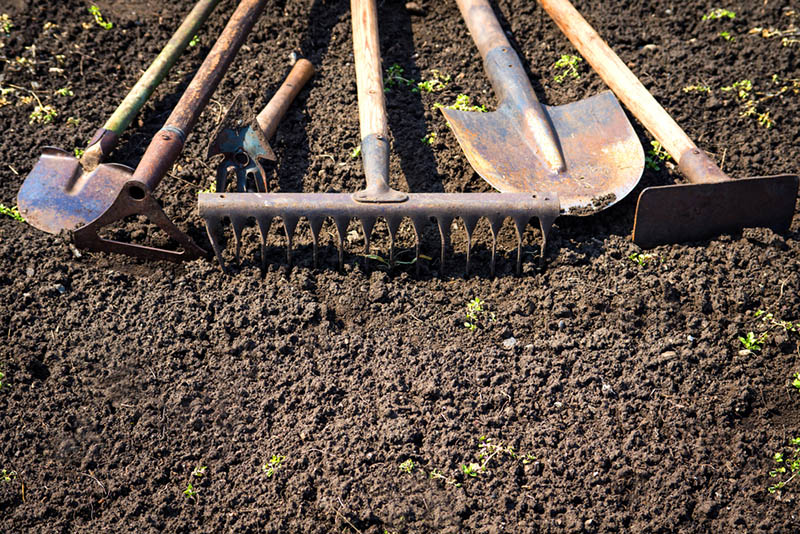 Szpadle, widły, grabie, pazurki i inne akcesoria którymi pracujemy w gliniastej, żyznej glebie, a zwłaszcza wilgotnej, będą potrzebowały silniejszej pielęgnacji. Warto je dokładnie wyczyścić szczotką, umyć wodą z mydłem, a na koniec osuszyć papierem i jeśli nie mają być już używane – pozostawić do dokładnego wysuszenia. Zapobiegnie to gwałtownemu kurczeniu się trzonków i rękojeści, a części metalowe zabezpieczy przed szybkim rdzewieniem. Jeśli rdza już się pojawiła, to należy ją bardzo dokładnie usunąć, do tak zwanego „gołego metalu” i zakonserwować narzędzia.